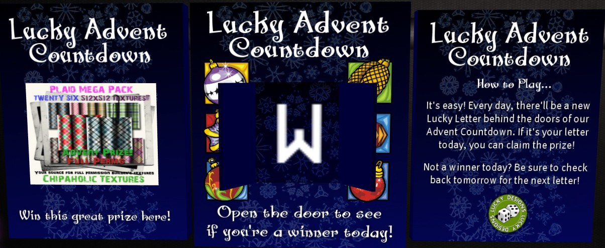 Every day at midnight, the Lucky Advent picks a new letter of the day. You need to stop by the store and click on the 'door' of the calendar so it will reveal to you the day's letter. If it matches the first letter of your first name, you win!