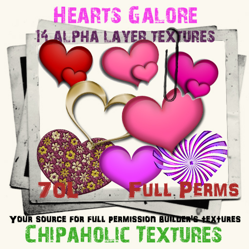 Firstly, the new release this week is a set of 14 alpha-layer heart textures. There's a variety of single and double glossy hearts, a couple of groovy hearts, floral hearts, and more!